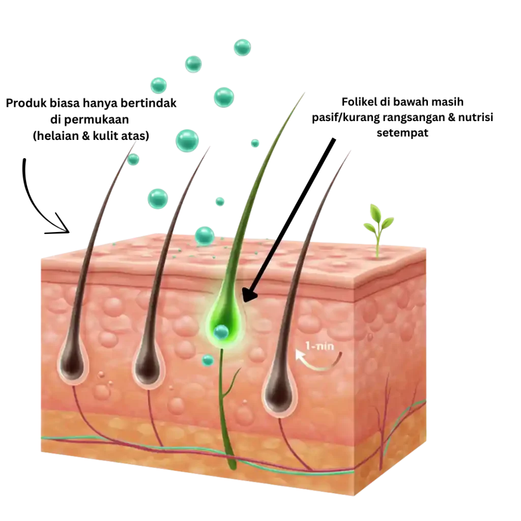 Dirumus khas menggunakan Castor, Jojoba, Almond, Vitamin E untuk scalp-barrier optimum.