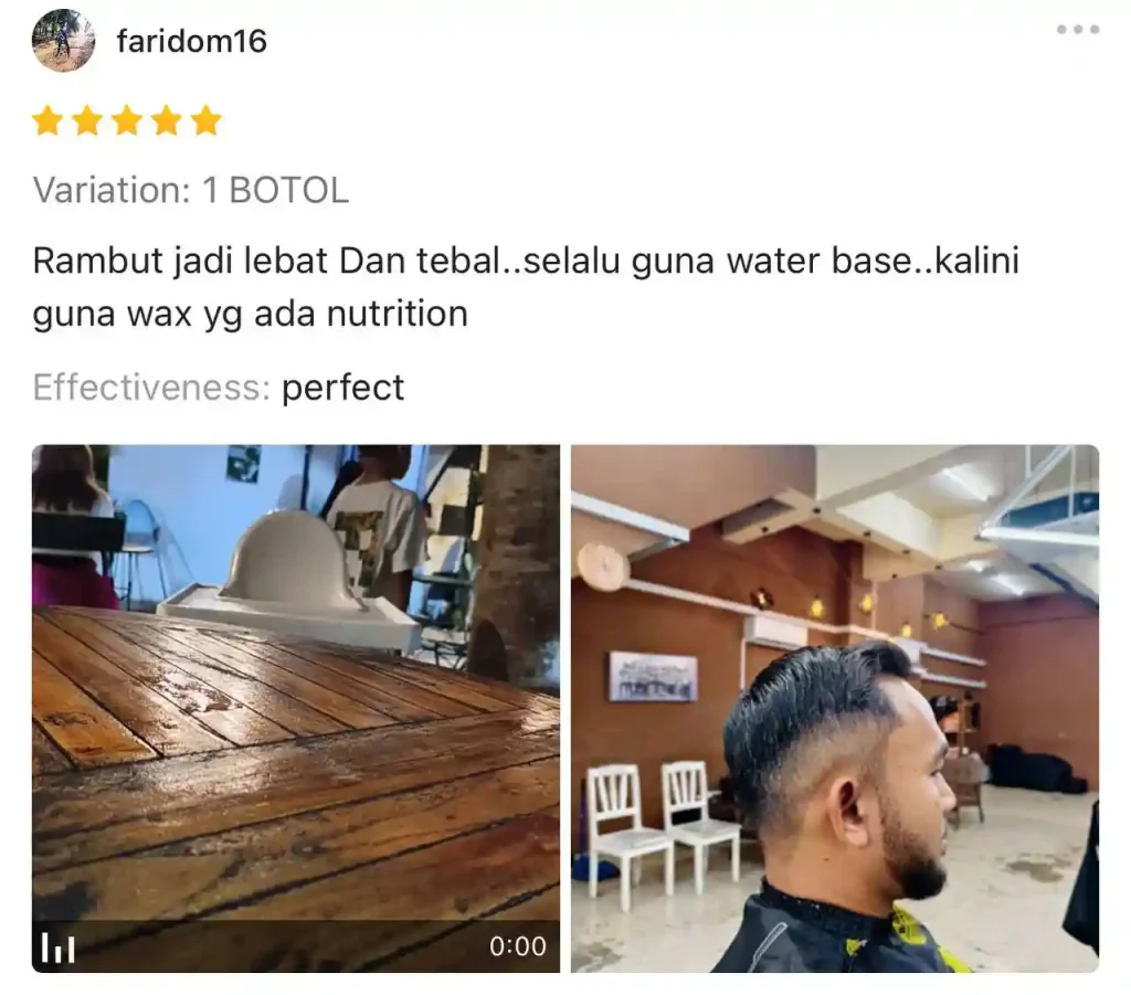 Aroma ringan & segar. Tekstur heavy hold, high shine tapi easy recomb—tidak tinggalkan habuk putih. Jika terasa berat, kurangkan kuantiti (sedikit pun sudah cukup).
